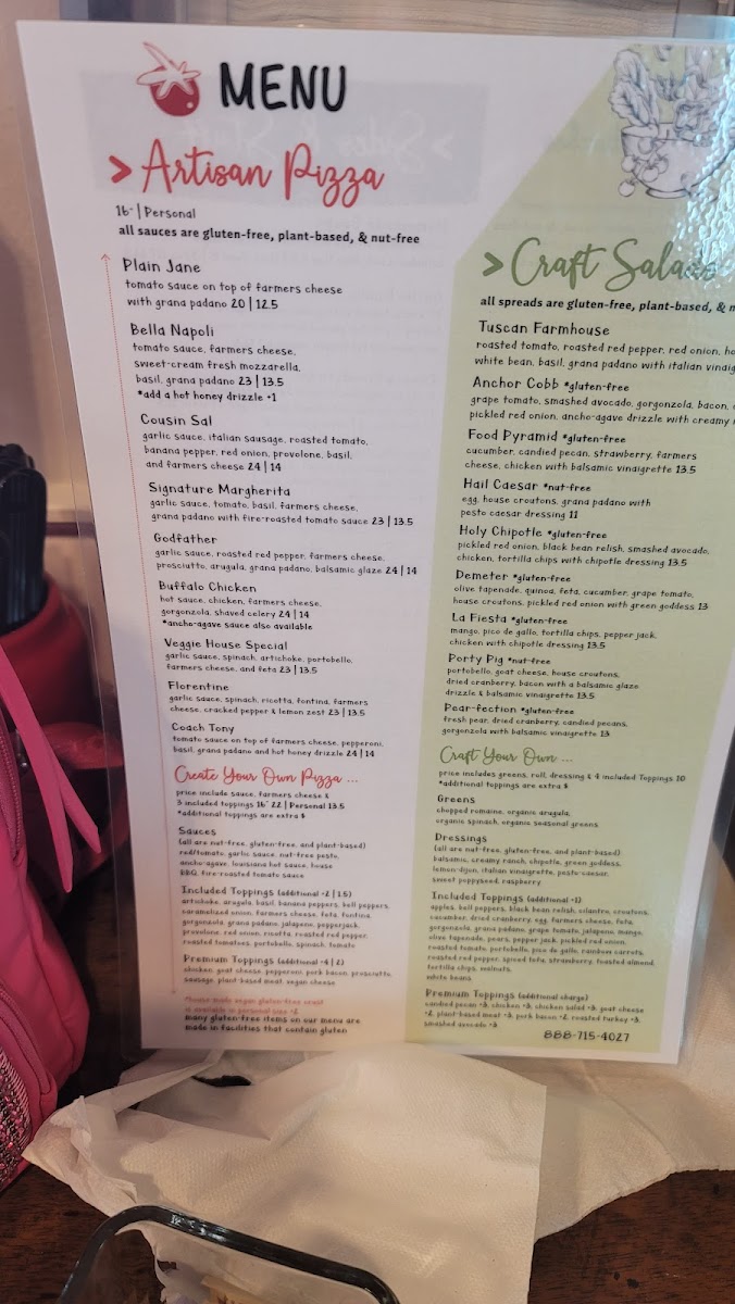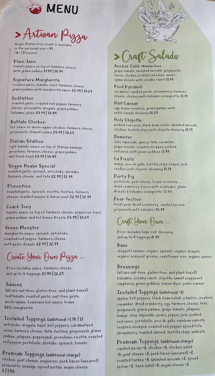 (can be made vegan | gluten-free in personal size only) organic dough, your choice of sauce, farmers cheese and three "included toppings" (additional toppings extra) *all sauces are vegan / nut & gluten-free